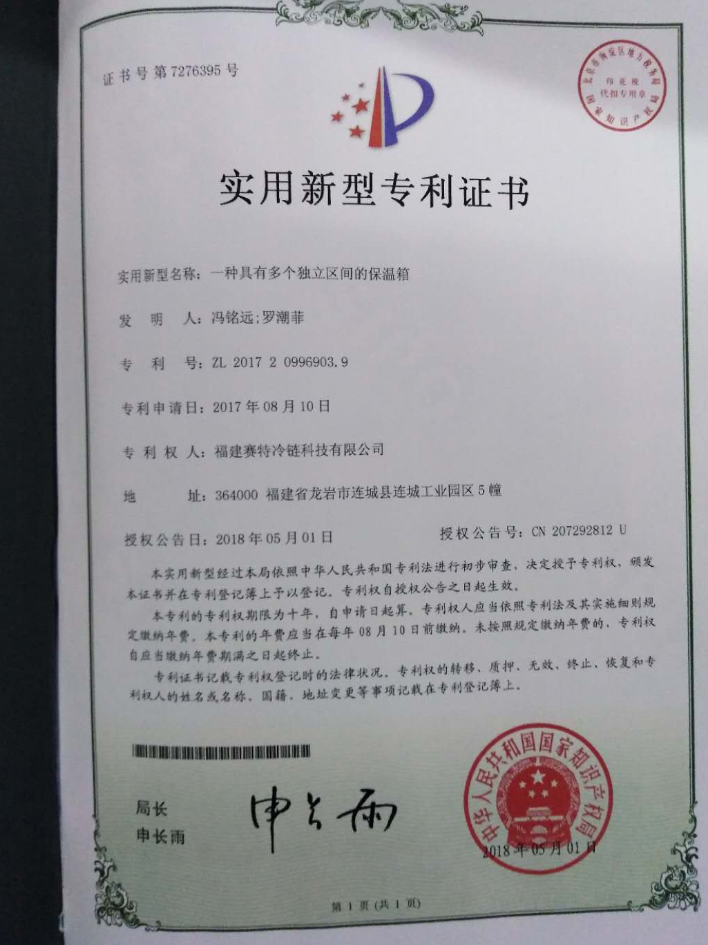 In 2018, the company obtained three authorized patents. Five items are still under review. They are: one kind of container heat preservation refrigeration cabinet, one kind of heat preservation cabinet with multiple independent spaces, high strength handle; another invention patent, four new patents are still under review